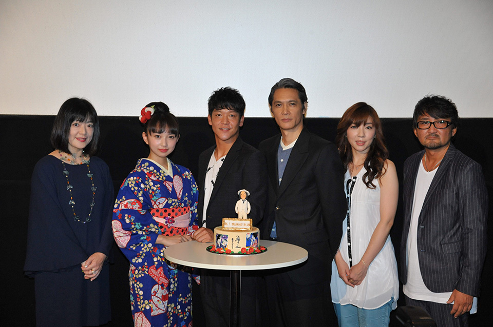 舞台挨拶終盤では、駿河太郎だけが知らなかった<夢二オリジナルケーキ>がサプライズで登場。ケーキの上にのった夢二のフィギアに